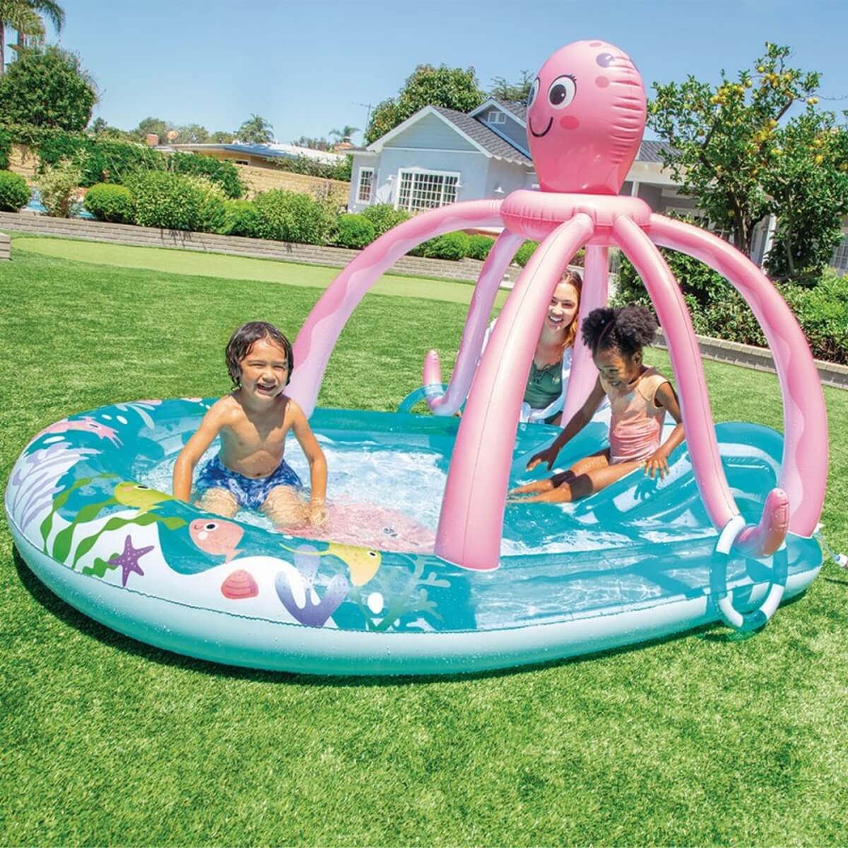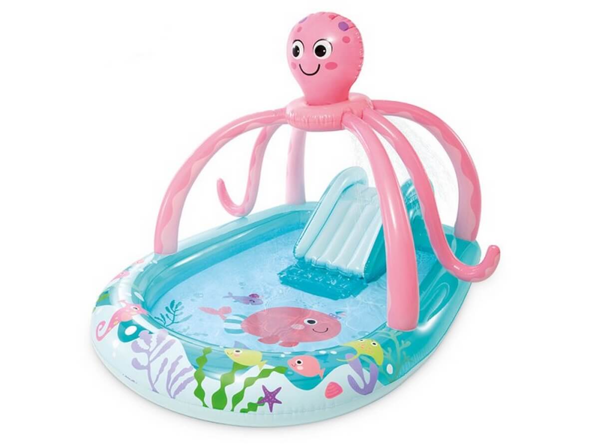 Водный игровой центр "FRIENDLY OCTOPUS PLAY CENTER" Intex 56138 очень красочный и интересный, мы уверенны, что он понравиться вашему малышу. Бассейн объемом 229 литров с горкой и небольшим навесом осьминога. В комплекте - два надувных колечка. Изготовлен из прочного пвх, толщиной 0,28 мм.